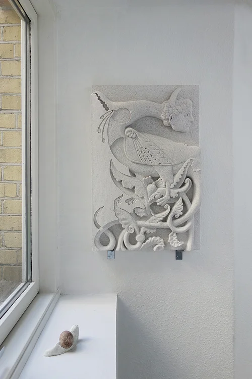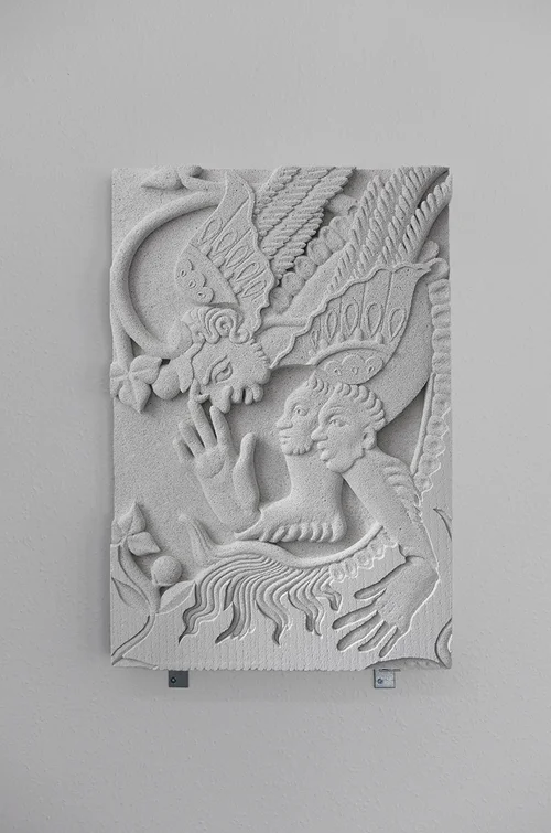 The exhibition will consist of a number of large stone reliefs meticulously carved out by hand arcing back to classical techniques but applied to contemporary industrial materials. The works, made out of aerated concrete pierced by industrial bolts to serve as methods of hanging, create a stark contrast to Itona Westerberg’s refined technique and the classical source material.